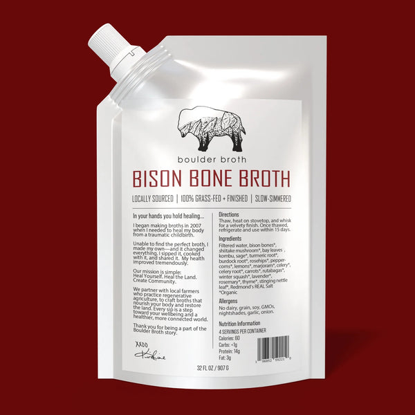 About The Product - Boulder Bone Broth (32 oz) Bison Bone Broth is slow-simmered from grass-fed and grass-finished buffalo bones to create a rich, gelatinous, and full-bodied stock. Roasted root vegetables like carrots, rutabagas, winter squashes, and sweet potatoes are added throughout cooking, along with subtle hints of fresh ginger and turmeric, giving every sip a depth of flavor and natural nourishment.