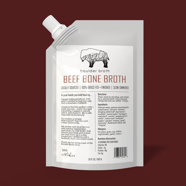 About The Product - Boulder Bone Broth Beef Broth (32 oz.) is the ultimate nutrient-packed elixir, slow-simmered to perfection and crafted for both flavor and wellness. They start by roasting grass-finished beef bones, knuckles, and oxtail, then simmer them for days to extract maximum richness. Just before packaging, we blend in the nutrient-dense marrow, giving each cup an incredible depth of flavor and an extra boost of protein, collagen, and minerals.