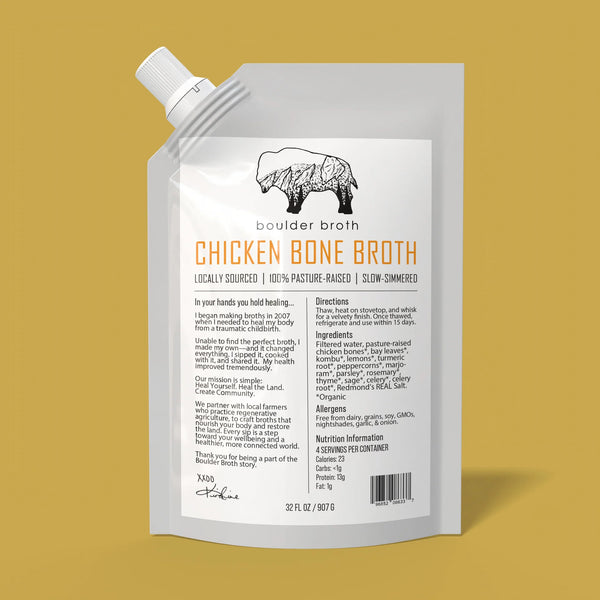 About The Product - Boulder Bone Broth Chicken Broth is hand crafted from chickens that happily roam on open pasture, their chicken bone broth is a community favorite and one of our original recipes. Slowly simmered for 20+ hours, this rich, flavorful broth captures the essence of home-cooked “Grandma’s chicken soup” with every sip. Fresh herbs like sage, thyme, marjoram, and bright hints of lemon create a soothing, aromatic broth perfect for sipping on its own or as a base in any recipe.