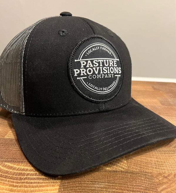 The custom trucker features a Pasture Provisions front patch, “You are what you (M)eat” inner stitching and a “Local” back tag.