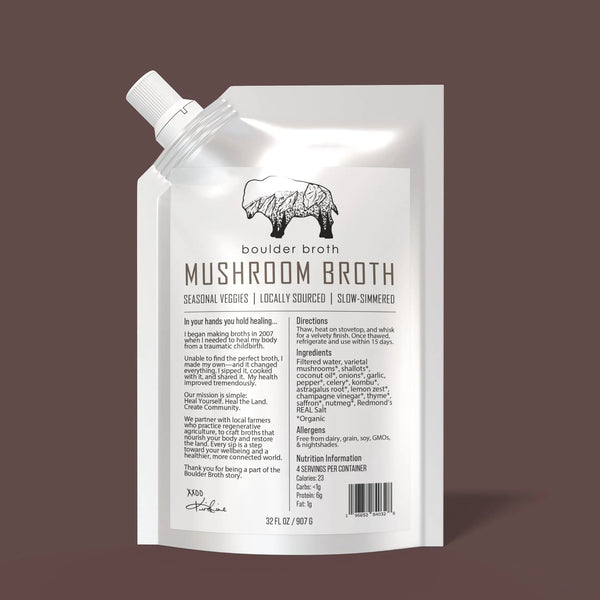 About The Product - Boulder Bone Broth Mushroom Broth (32 oz.) is something truly unique. Experience the rich, woodsy flavor of a medley of roasted mushrooms sourced from Hazel Dell, simmered to perfection for a deeply savory, buttery broth. With its earthy aroma and subtle sweetness, this broth is ideal for enhancing creamy pasta dishes, risottos, soups, or enjoyed simply on its own.